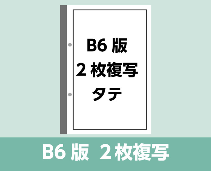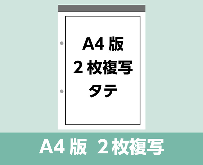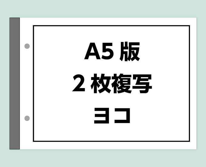 ○2枚複写 ○50組:1組 ○刷り色は1枚目(黒・紺)2枚目(黒・紺) ○表紙は色上質に社名等印刷可能 ○2穴 ○切り取りミシン目、下敷付きはありません。(別で下敷をつけることは可)