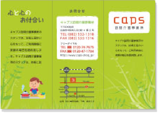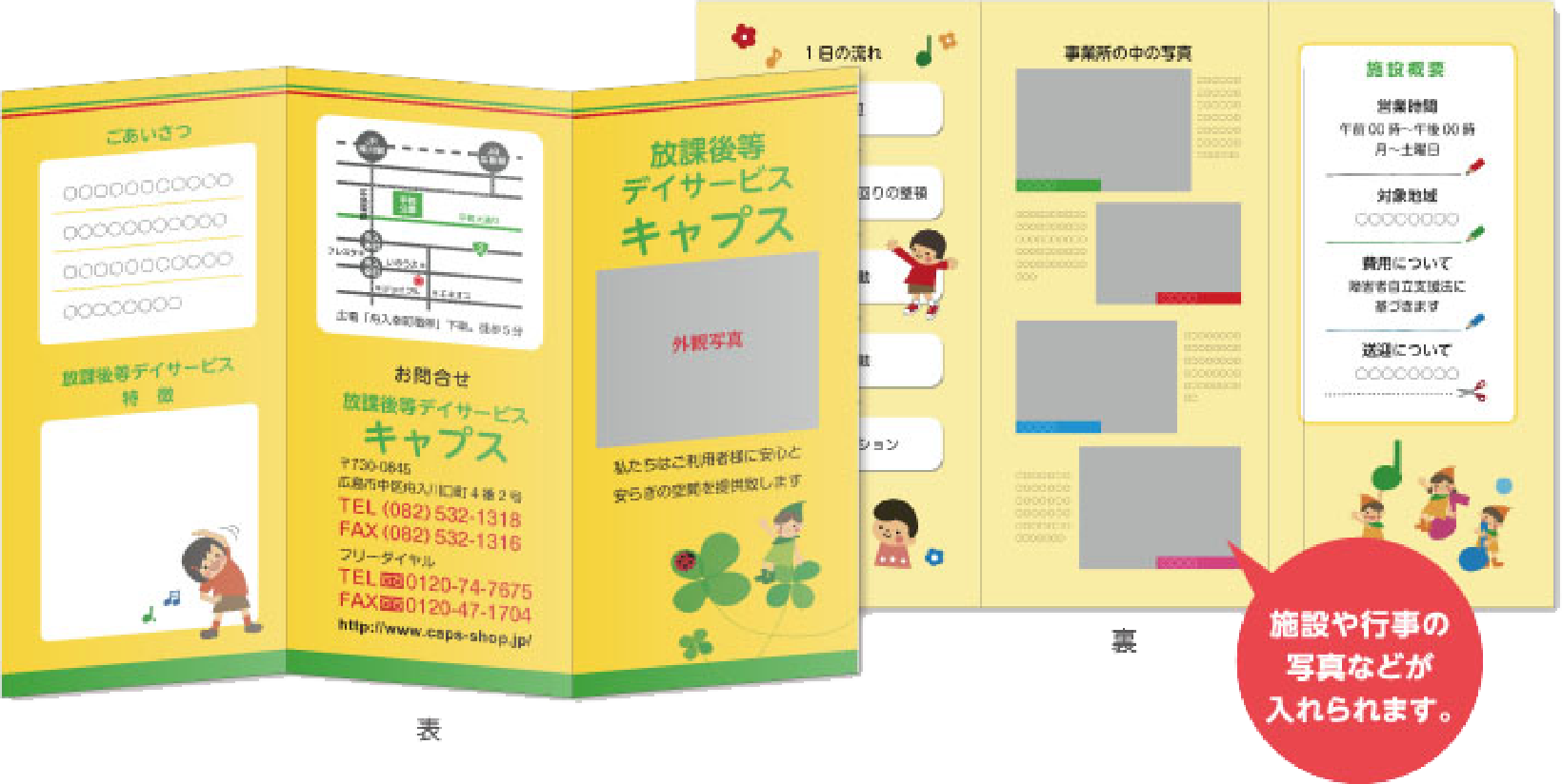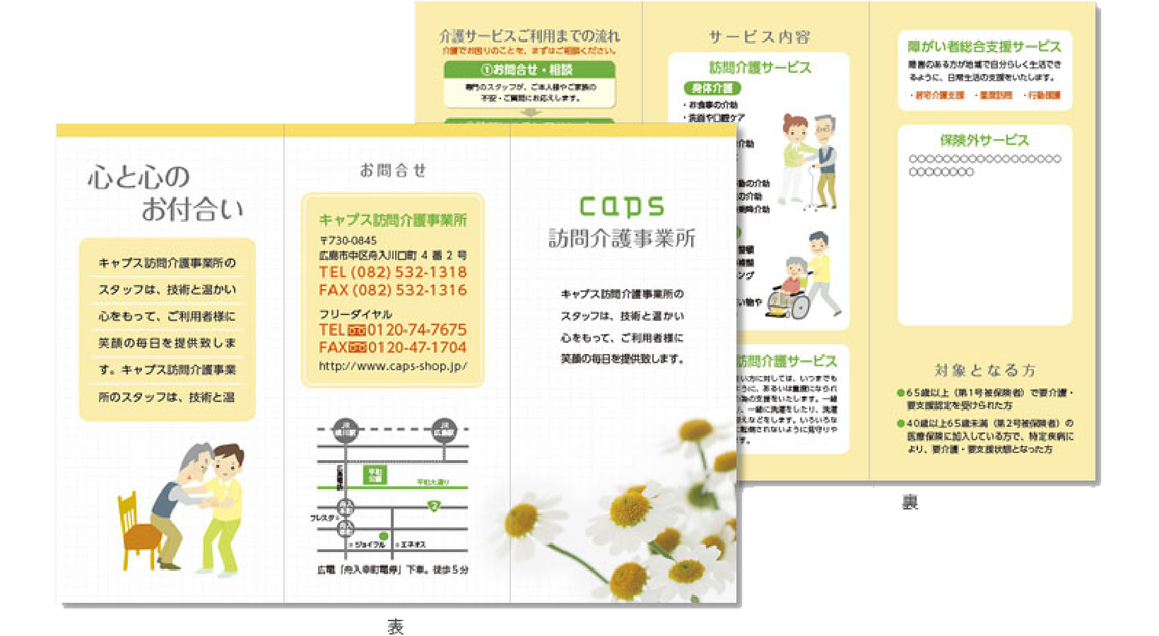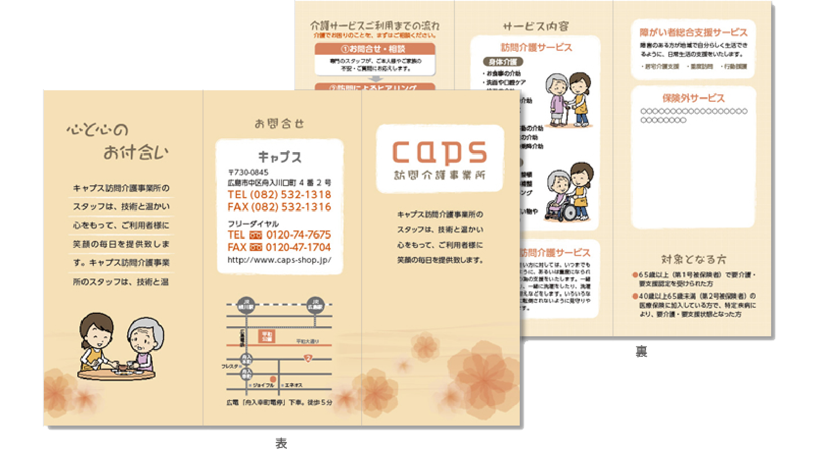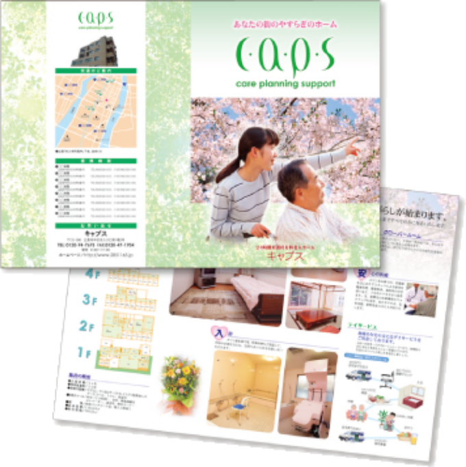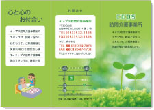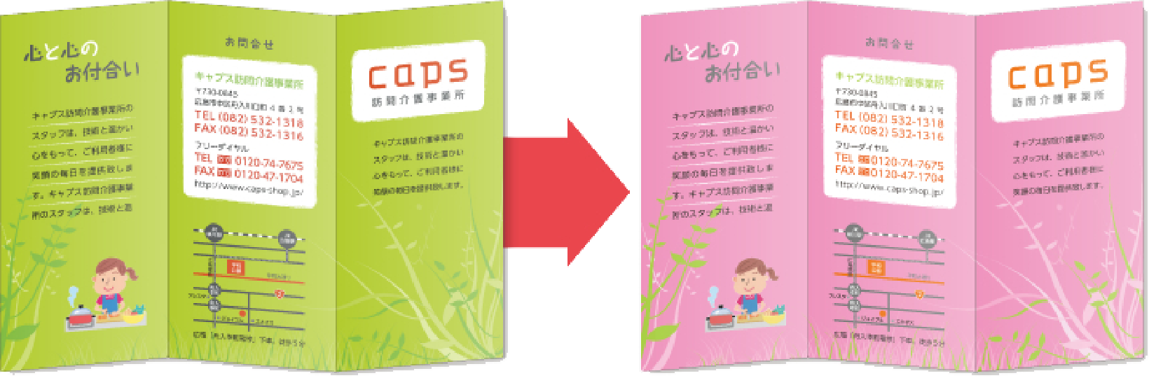 事業所のカラーなどに合わせ、お好きな色やデザインでオリジナリティのあるパンフレット作成をお手伝いします。