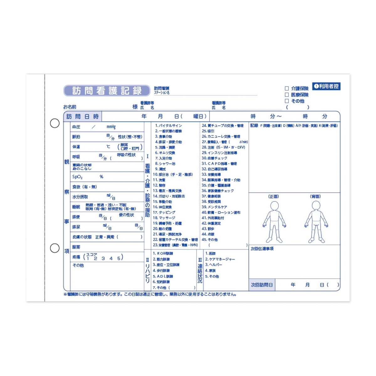 人型の絵柄入りで記入しやすい、利用者控え、ステーション控えの2枚複写仕様、A5版。