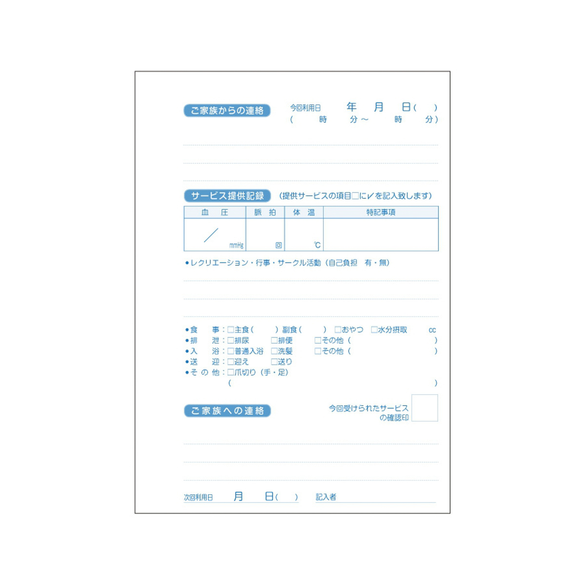 複写式デイ日誌「リズミィ簡易版」の1枚目と記録内容は同じですが、ノート式で、栄養ケア・口腔ケア・機能向上ケアを省き、健康チェック・食事・排泄・入浴・送迎のチェックのみの簡単な日誌です。
