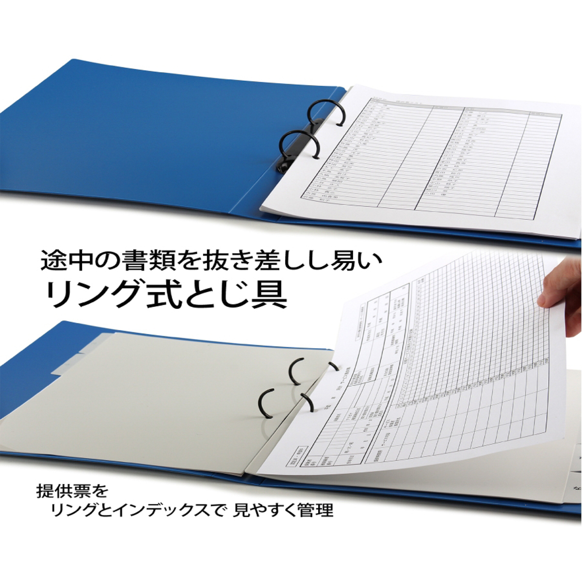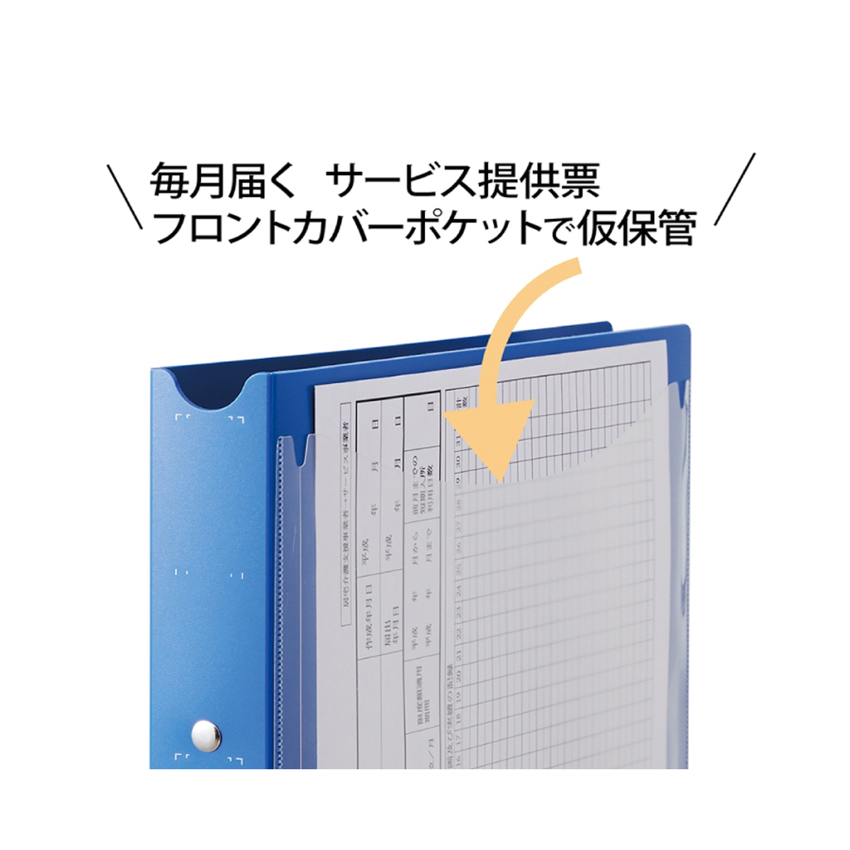 フロントには、書類の仮保管に便利なポケットがついており、背表紙には「提供票」と印刷済み。きれいに整理できます♪