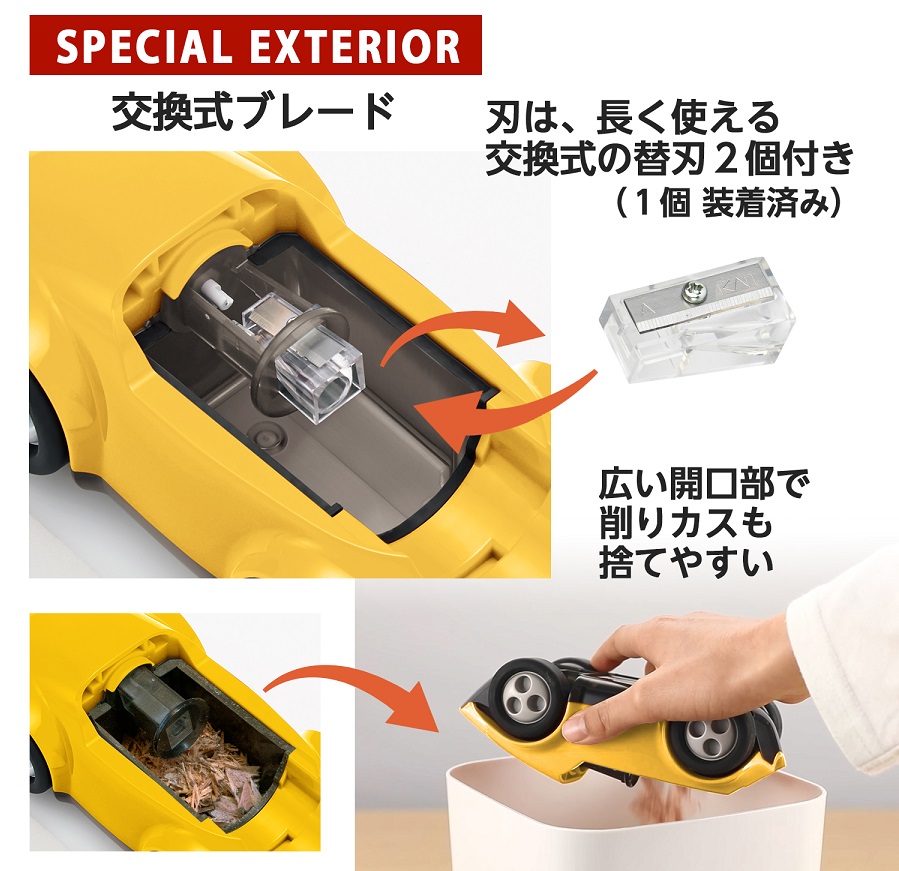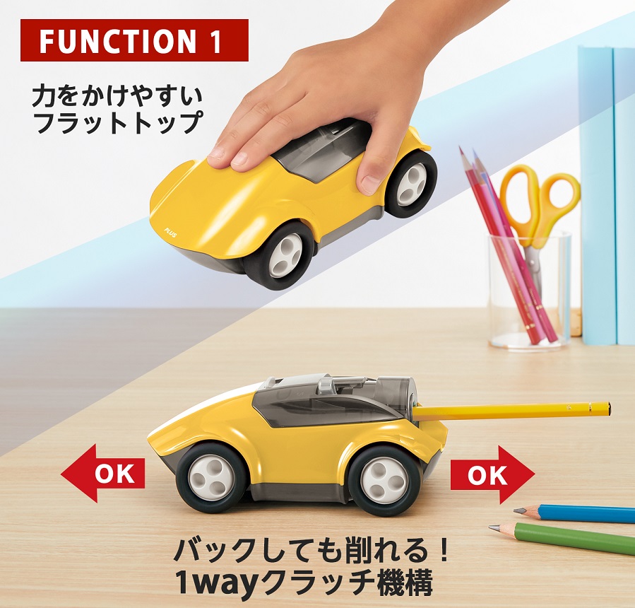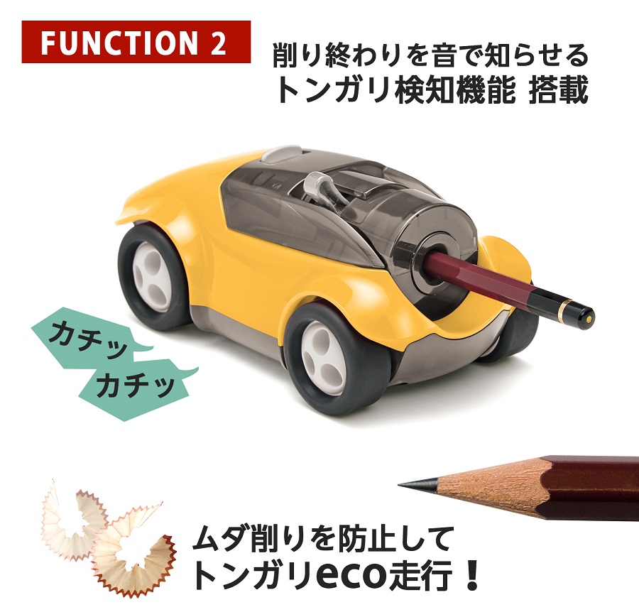「ハシレ!エンピツケズリ!」は、鉛筆を差し込み、腕、肩、体重を使って車を動かすだけで、楽しく軽く、子どもでも簡単に鉛筆を削ることができます。
