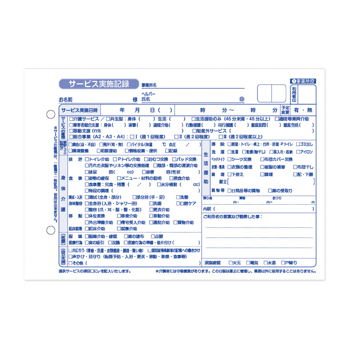 訪問介護事業所(ヘルパーステーション)において訪問介護サービス提供時にヘルパー活動記録として使用する、介護報酬請求の根拠となる『介護サービス実施記録用紙/介護記録』です。