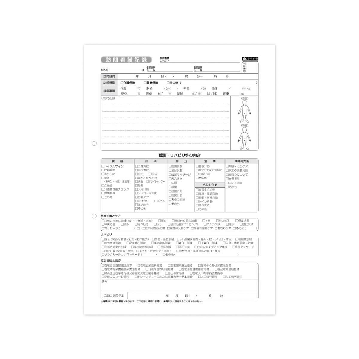 訪問リハにも使用できます。 人型の絵柄入りで記入しやすい、利用者控え、ステーション控えの2枚複写仕様、A4版。