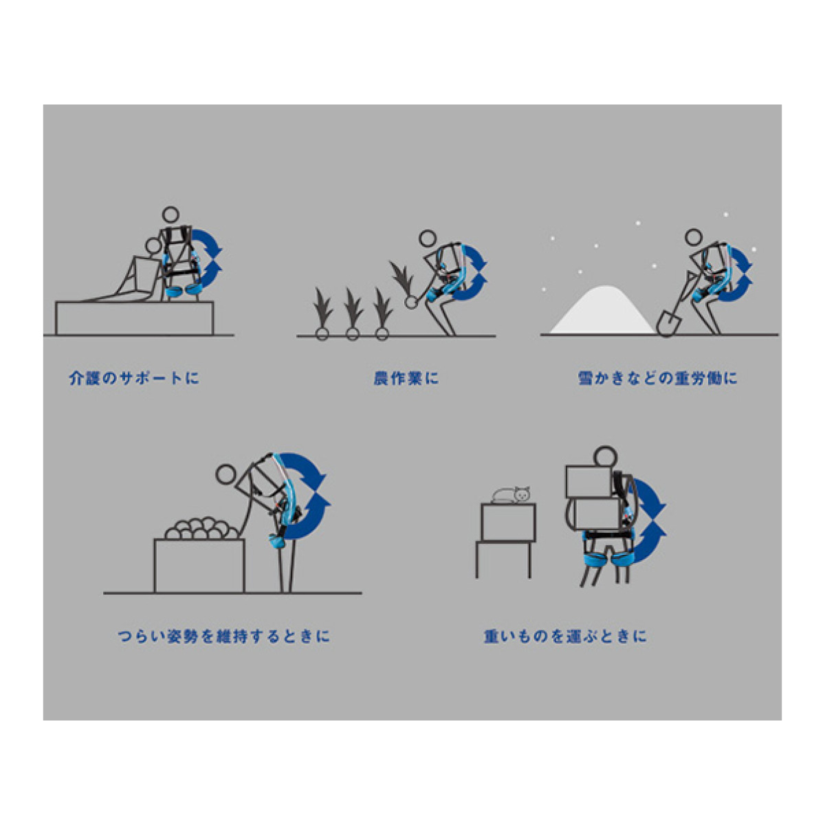 ご自宅、職場、介護サポート、農作業、雪かきなどの重労働、つらい姿勢を維持するとき、重いものを運ぶときなど、いろいろなシーンでお使いいただけます。