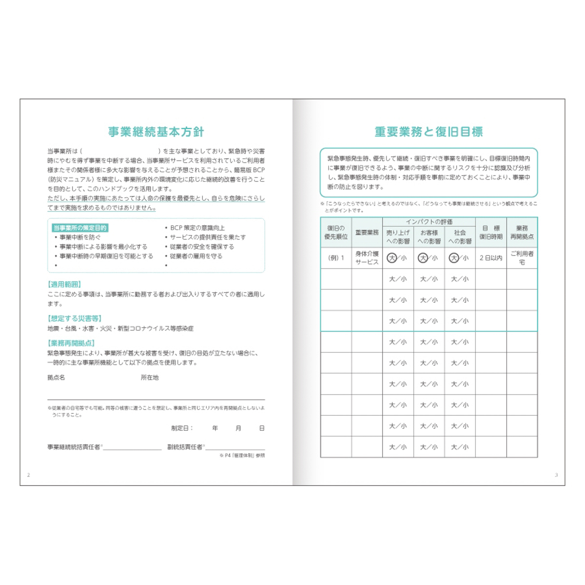 この防災マニュアルは、簡易版BCPとして、実際のBCPでも策定する内容を分かりやすくして盛り込んでいます。
